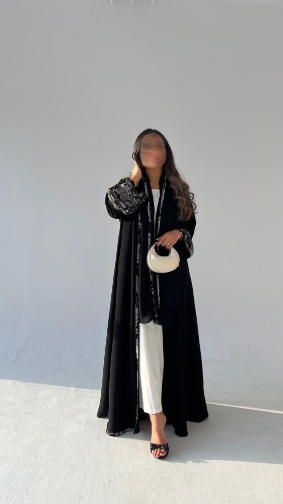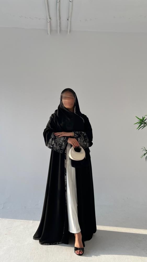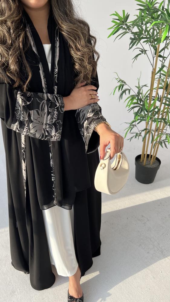 - التفصيلة المميزة: تدخيلة أنيقة من قماش التفته اللامع والمُزخرف (نقوش نباتية بلون فضي/رمادي) تزين الأكمام ومحيط العباية الأمامي.