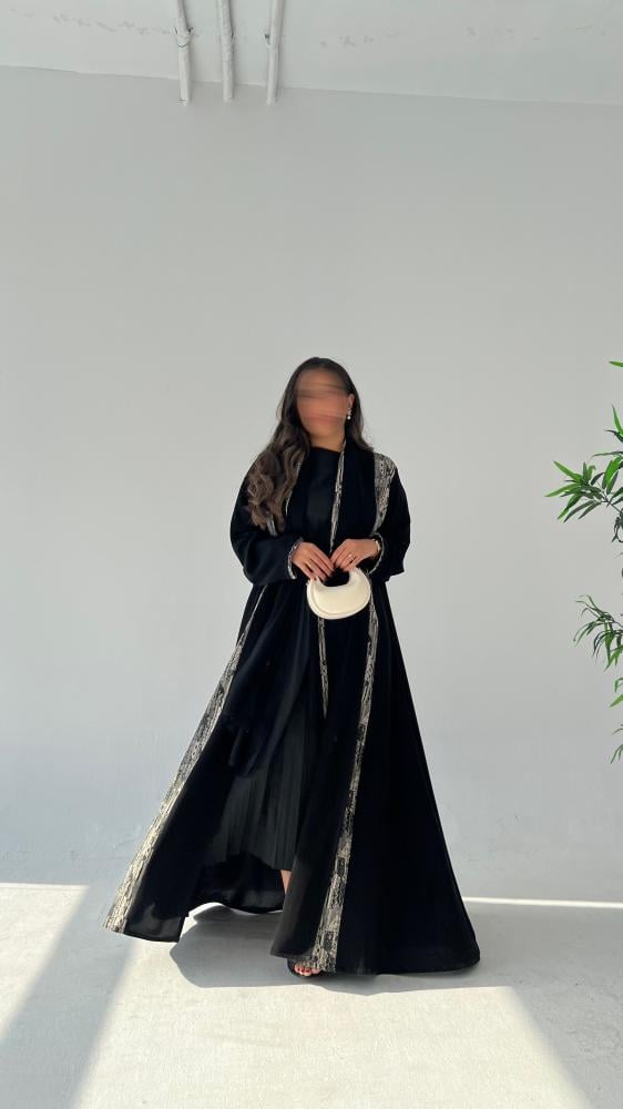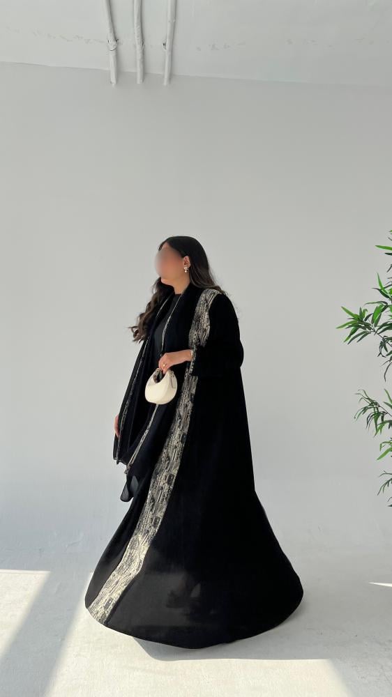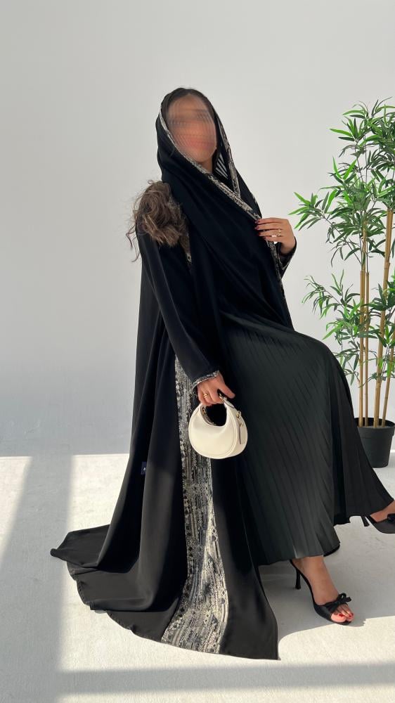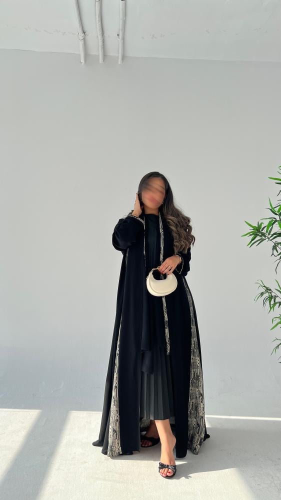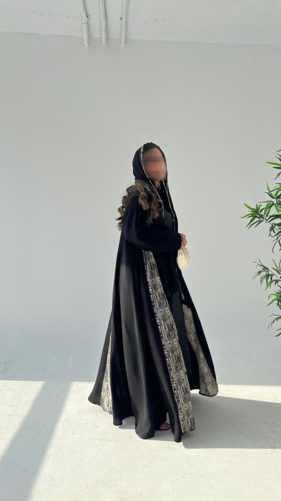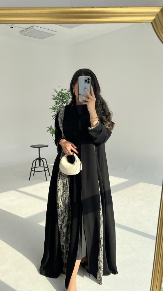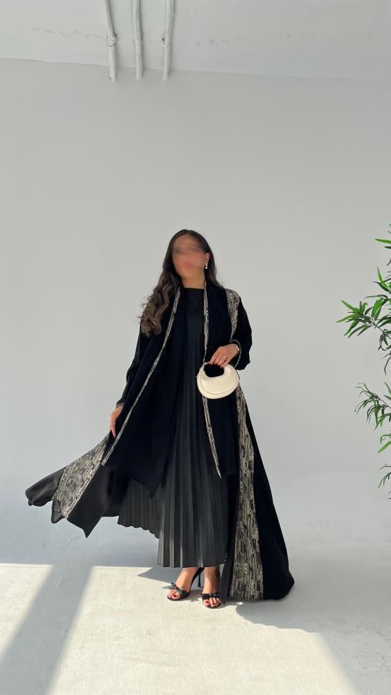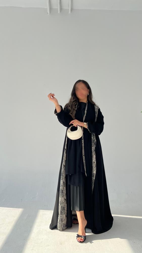 • التفصيلة المميزة: تدخيلة أنيقة من قماش الجاكار (لون أسود وأبيض/رمادي بنقش هندسي/عصري) تزين محيط العباية الأمامي.