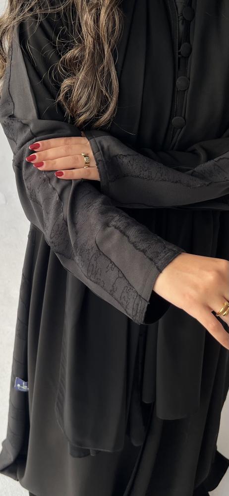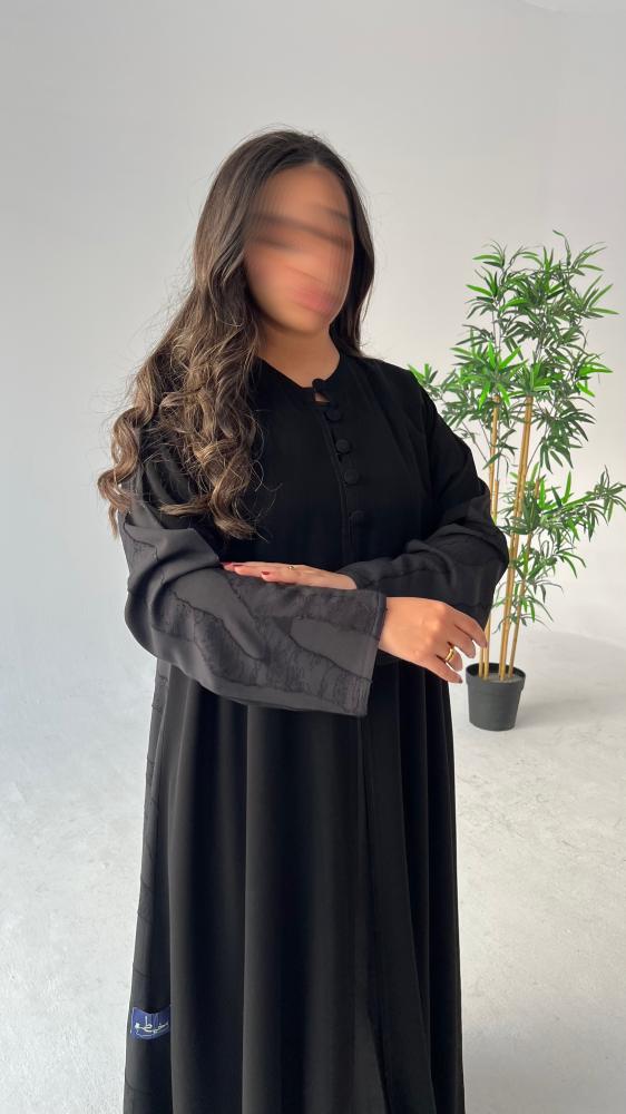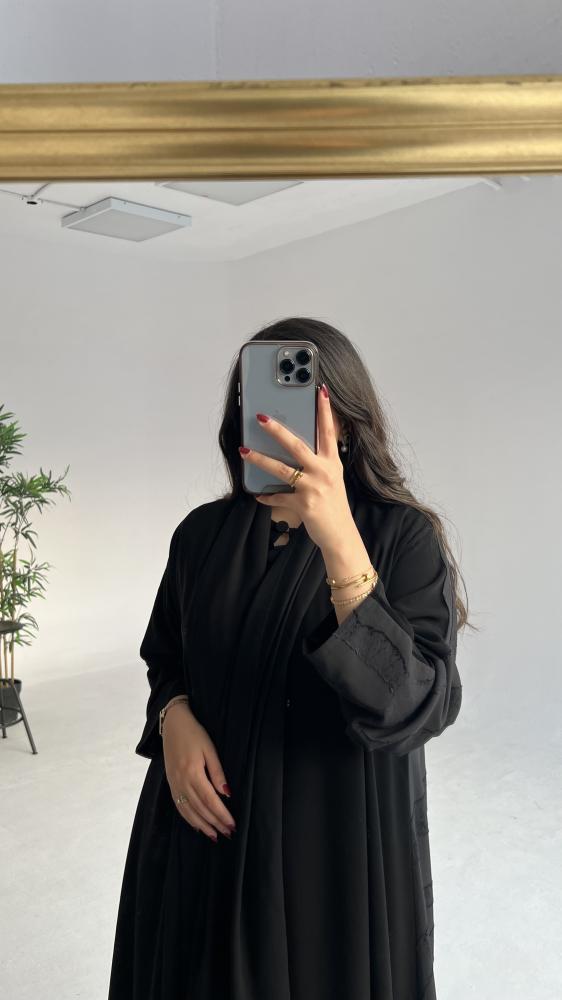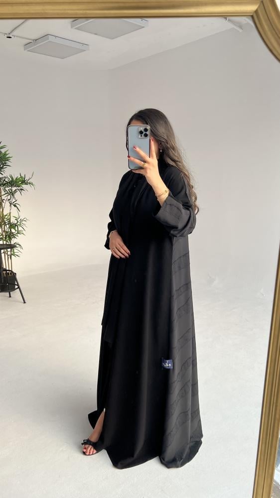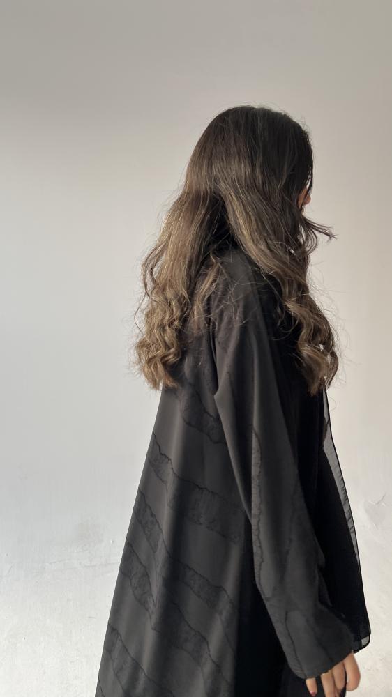 هذه العباية مصنوعة من قماش الكريب الملكي الكوري الناعم الذي يمنحكِ شعورًا بالراحة والأناقة. تتميز بقصة نص كلوش التي تضفي عليها مظهراً واسعاً ومريحاً. أما اللمسة الجمالية الفريدة فتأتي من تدخيلة شيفون جاكار من الخلف، التي تزيدها تميزاً وتفرداً مع كل حركة.